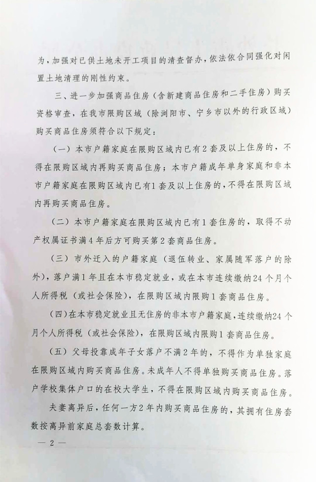 根据《通知》,长沙房地产市场将从项目监管、土地出让、购房资格、户籍管理、严禁炒作等方面进行全面调控,规定本市户籍家庭在限购区域内已有1套住房的,取得不动产权属证书满4年后方可购买第2套商品住房;市外迁入的户籍家庭(退伍转业、家属随军落户的除外),落户满1年且在本市稳定就业,或在本市连续缴纳24个月个人所得税(或社会保险),在限购区域内限购1套商品住房。